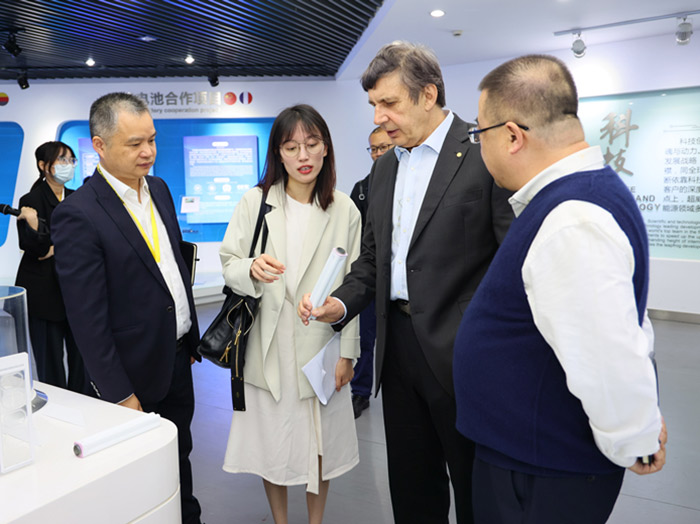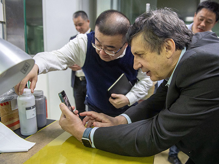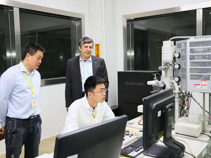 在科技中心,安德烈?海姆教授饒有興趣地參觀了超威科技項目研發(fā)實驗室。當(dāng)看到石墨烯項目組研發(fā)人員正在進(jìn)行材料分析時,他饒有興趣地拿起一瓶石墨烯材料仔細(xì)觀察,并與研發(fā)人員進(jìn)行相關(guān)技術(shù)問題。
