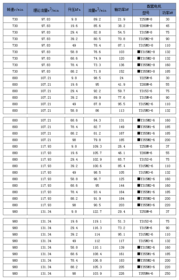 ARF250標(biāo)準(zhǔn)型羅茨鼓風(fēng)機(jī)選型性能參數(shù)表